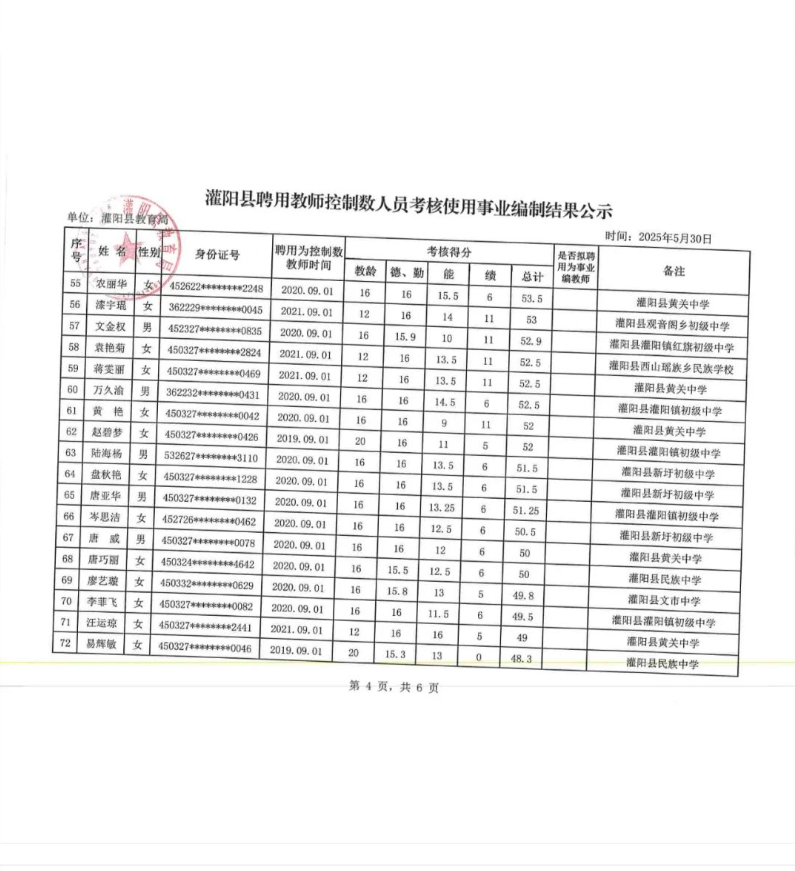 灌陽縣聘用教師控制數(shù)人員考核使用事業(yè)編制結(jié)果公示