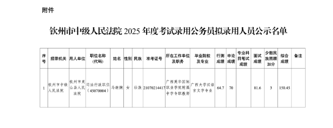 附件:欽州市中級人民法院2025年度考試錄用公務(wù)員擬錄用人員公示名單