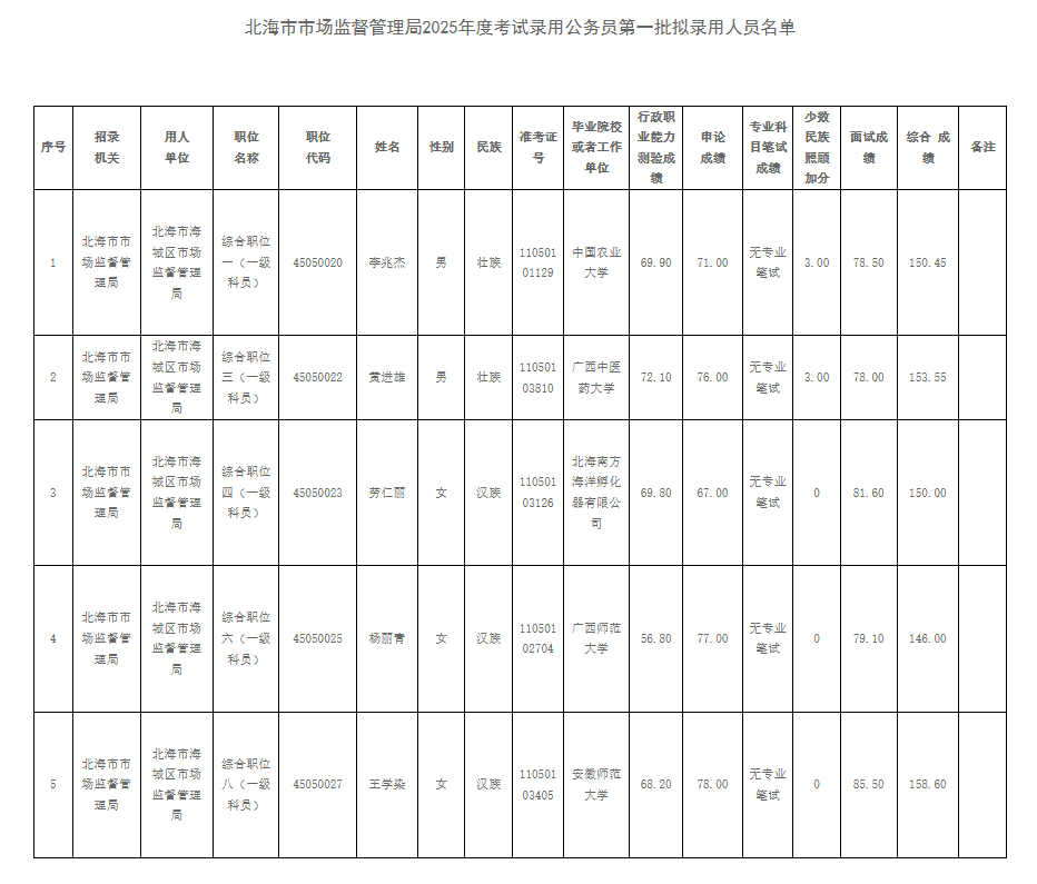 北海市市場(chǎng)監(jiān)督管理局2025年度考試錄用公務(wù)員擬錄用人員公示(第一批)