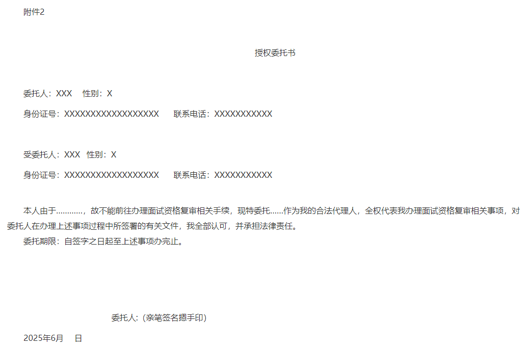 (二)面試資格復(fù)審一般應(yīng)由報(bào)考人員本人參加。因特殊原因需由他人代為參加面試資格復(fù)審的,須由報(bào)考人員出具委托書(shū)(委托書(shū)應(yīng)有委托人、受托人的姓名和身份證號(hào)碼,委托原因和代辦事項(xiàng),委托人親筆簽名等,詳見(jiàn)附件2),經(jīng)面試復(fù)審單位同意后,可以委托代理。