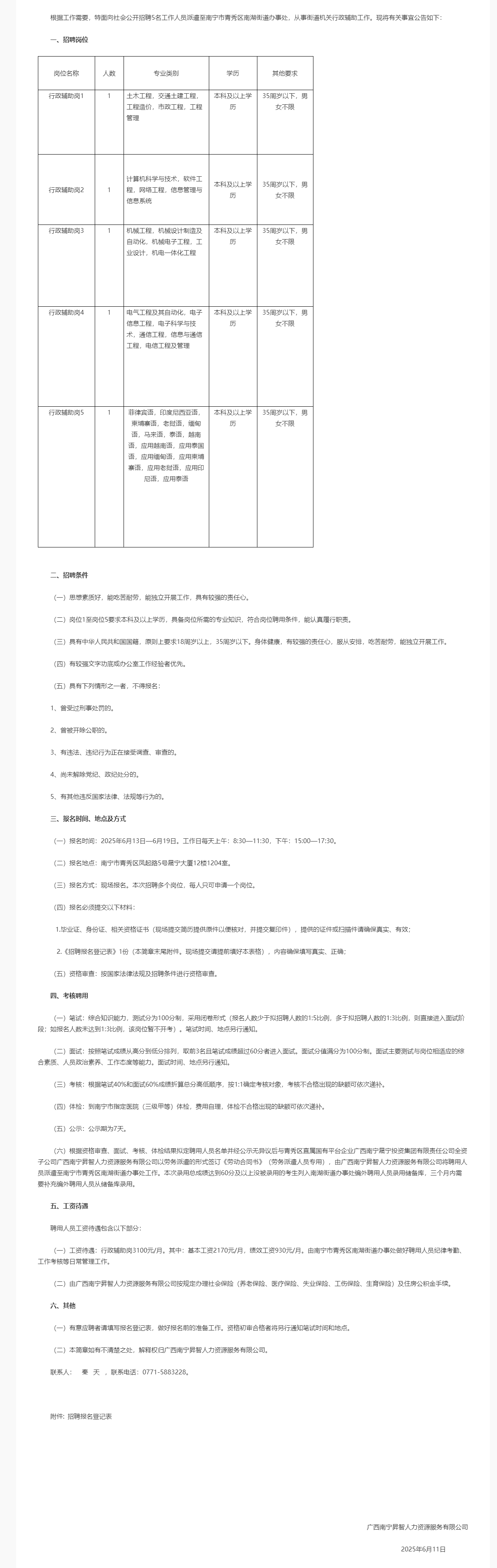 2025年廣西南寧昇智人力資源服務有限公司第22期(南寧市青秀區(qū)南湖街道辦事處)招聘5人