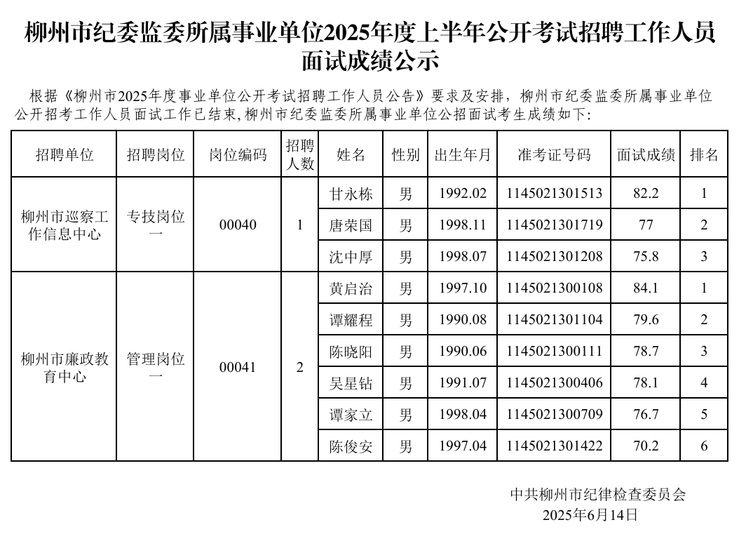 原文標(biāo)題:柳州市紀(jì)委監(jiān)委所屬事業(yè)單位2025年度上半年公開考試招聘工作人員面試成績(jī)公示