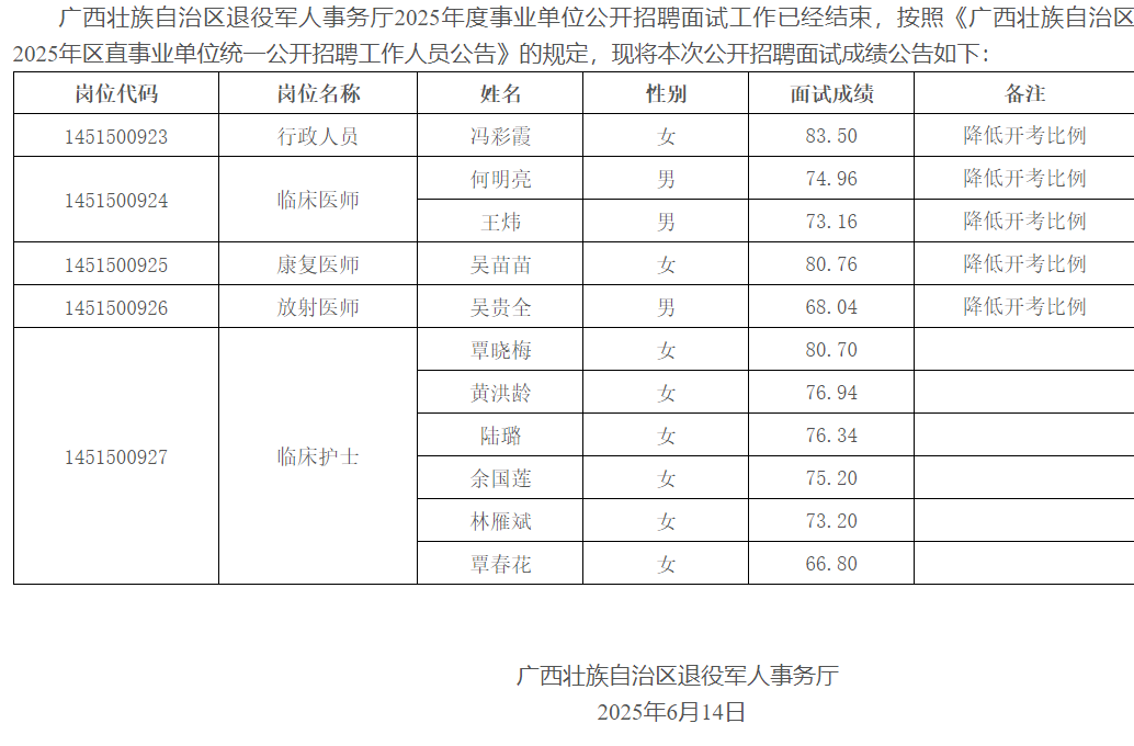 廣西壯族自治區(qū)退役軍人事務廳關于發(fā)布2025年度事業(yè)單位公開招聘面試成績的公告