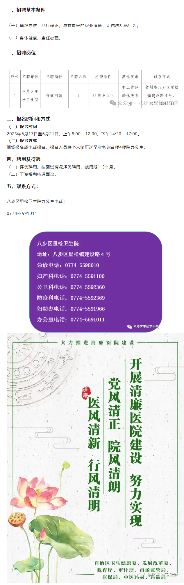 原文標(biāo)題:八步區(qū)里松衛(wèi)生院2025年招聘1名食堂工作人員的公告