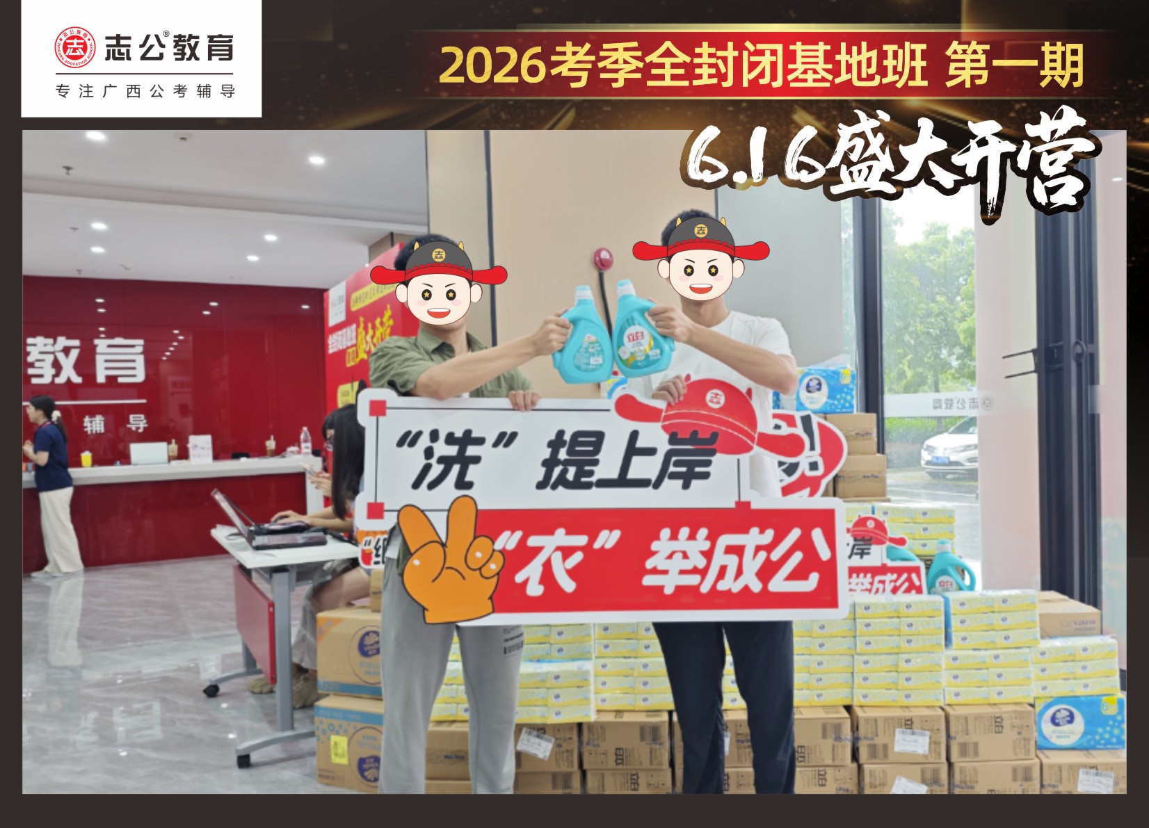 今天的開(kāi)班還有一系列小活動(dòng)噢~瞧!——“學(xué)員打卡活動(dòng)”,所有今天到場(chǎng)的基地班學(xué)員,通過(guò)做一些小任務(wù)的方式,可以到前臺(tái)領(lǐng)取生活禮包即可領(lǐng)取生活禮品1份(一提六包的紙巾,或者一瓶洗衣液),這也是志公教育對(duì)所有學(xué)員的美好祝愿,預(yù)祝大家未來(lái)能夠“紙”定成公,“洗”提上/岸,“衣舉成公”!