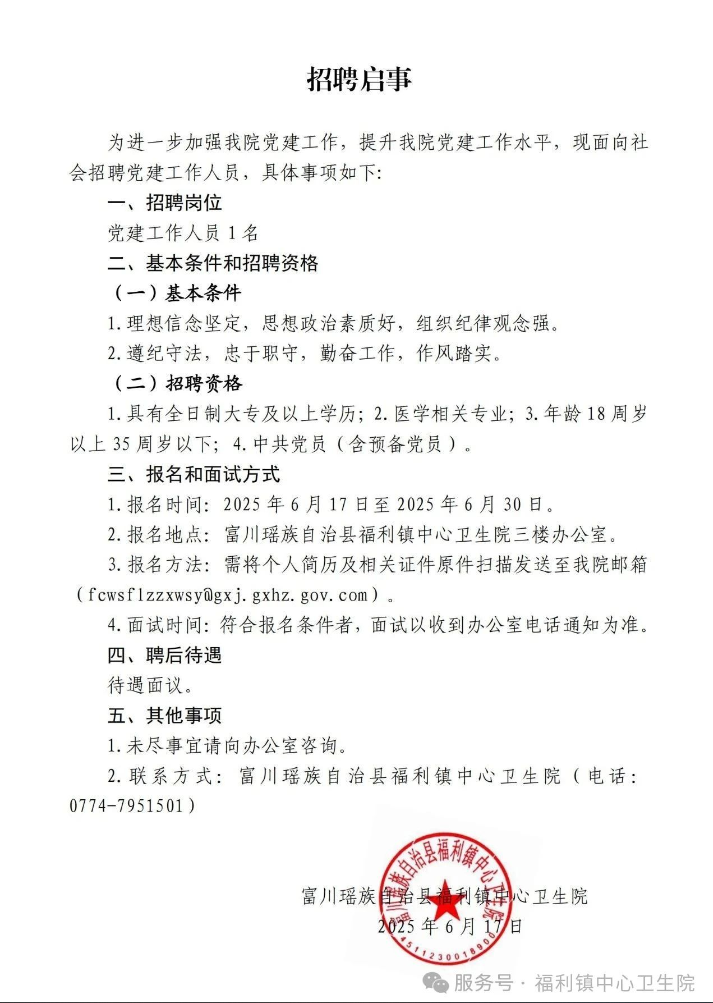 2025年福利鎮(zhèn)中心衛(wèi)生院招聘黨建工作人員1人