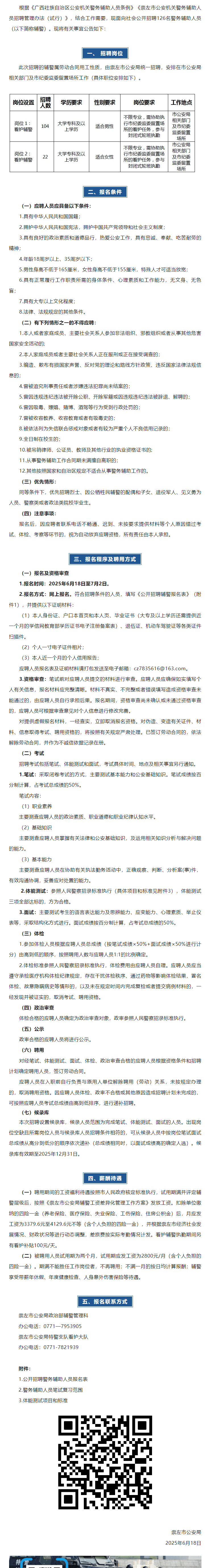 2025年崇左市公安局警務(wù)輔助人員招聘126人