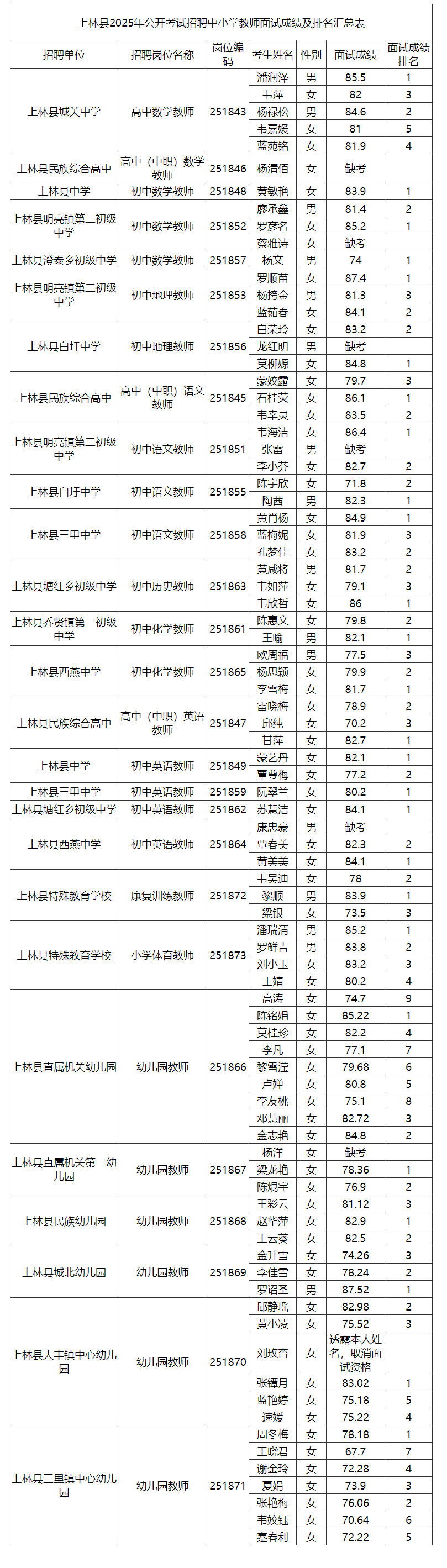 原文標題:上林縣2025年公開考試招聘中小學教師面試成績及排名公告