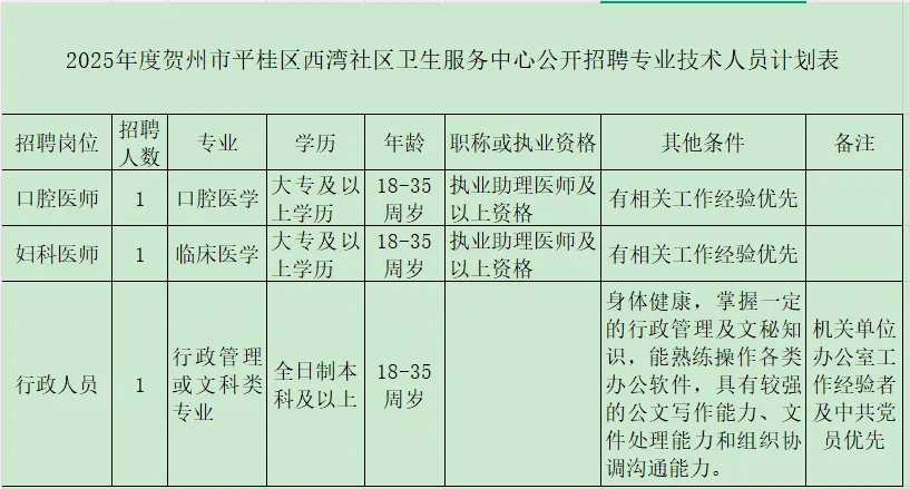 2025年賀州市平桂區(qū)西灣社區(qū)衛(wèi)生服務(wù)中心招聘公告