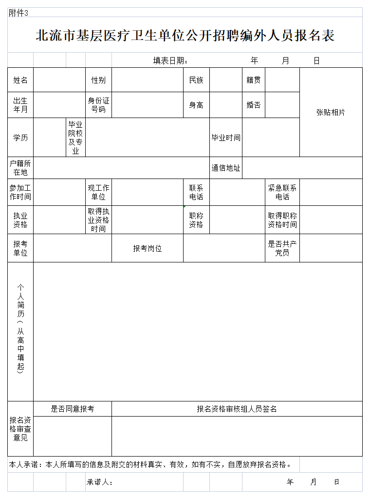 2.《北流市基層醫(yī)療衛(wèi)生單位公開招聘編外人員報(bào)名表》(附件3);