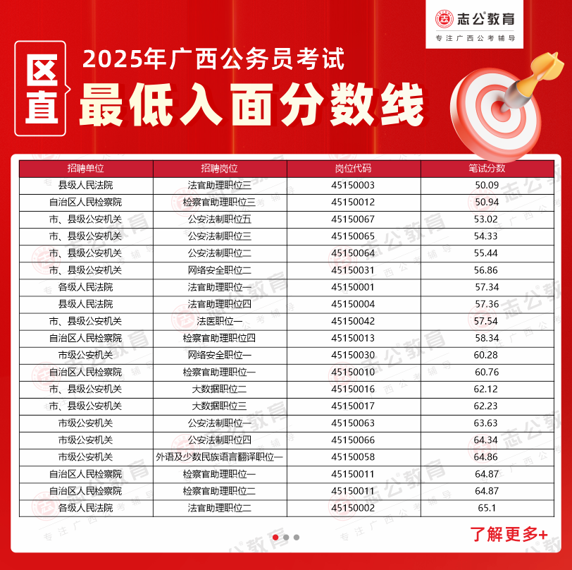 2025年廣西公務(wù)員考試筆試成績及面試入圍名單已公布。為幫助考生了解各單位招錄情況,本文根據(jù)官方發(fā)布的面試資格審查公告,整理了部分區(qū)直單位的進面分數(shù)數(shù)據(jù),供廣大考生在備考過程中進行參考。